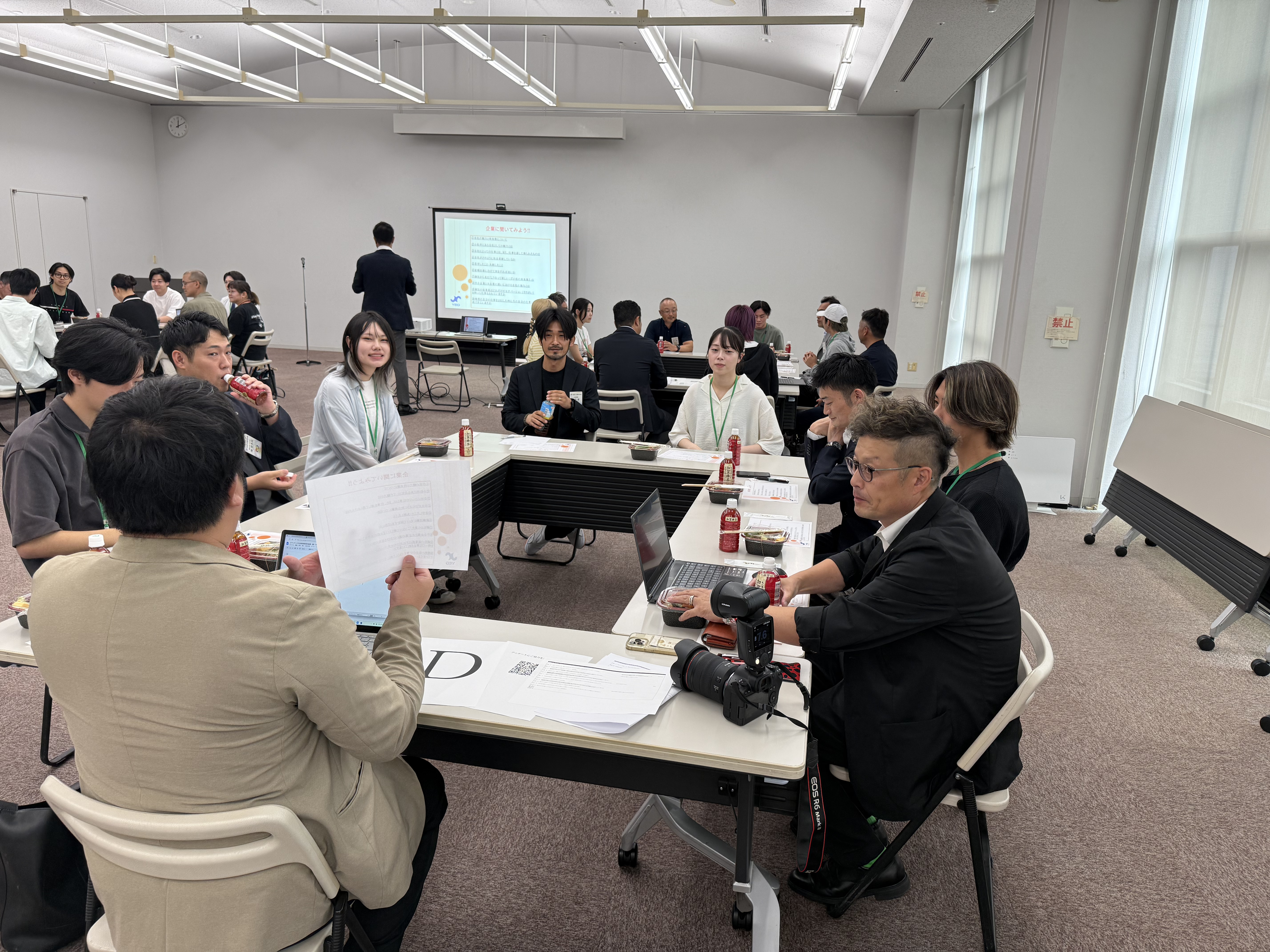 石川県産食材を使用した「加賀飯弁当」を味わいながら、参加企業の若手経営者や社員が自社の取り組み、地域との関わり、働く魅力などを紹介。学生からも「小松で働くことに興味を持った」との声が多く聞かれました。